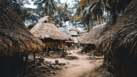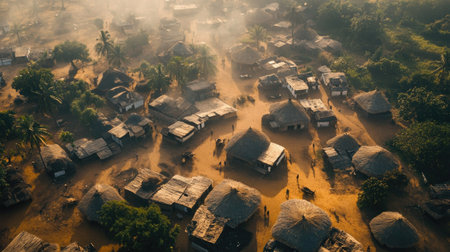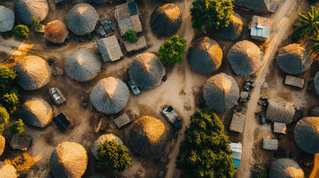 Top view of a quiet African village with thatched roofs, offering open space for text