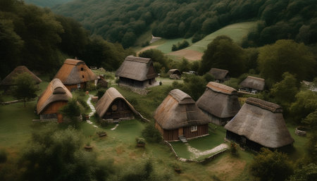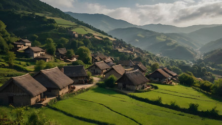 Cinematic view of a quaint village nestled in the serene hills at twilight