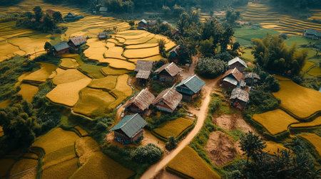 Aerial view of the rural village and green rice field landscape at morning in the northern thailand