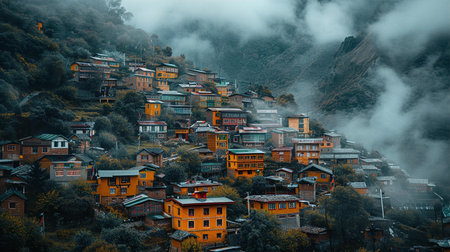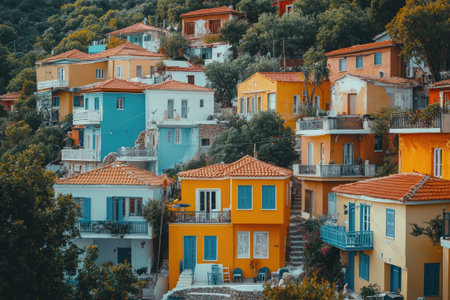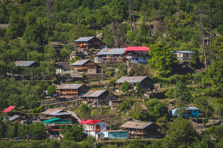 A beautiful hillside village with many charming houses nestled among lush green trees and mountains. The scene is picturesque and peaceful, evoking a sense of calm and serenity.