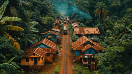 Aerial view of local rural village in the valley on faraway at countryside among the tropical rainforest at Southeast Asia