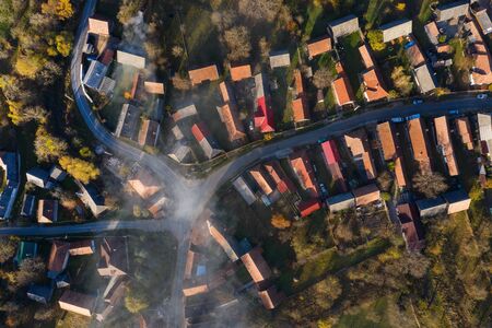 High angle aerial view of a small village, autumn countryside in Transilvania, Romania