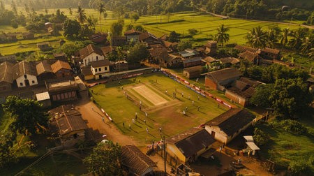 Aerial view of a small village with a central, vibrant cricket ground