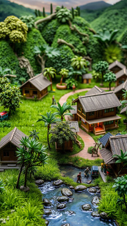 Miniature of a village in the middle of the jungle. Miniature model of a village.