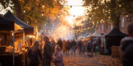 Evening market with food stalls and visitors during autumn in a city