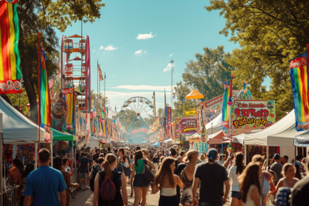 A large crowd of people walks around a carnival, enjoying various attractions and activities, A bustling summer festival with cheerful crowds and colorful banners, AI Generated