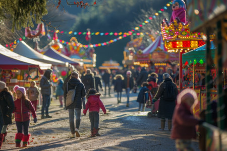 A crowd of people walking down a street lined with carnival booths, filled with lively activity and excitement, A festive carnival grounds bustling with families and children