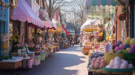 Rows of vibrant flower displays fill the charming outdoor market as shoppers explore colorful stalls adorned with seasonal decorations, capturing the essence of spring in a lively atmosphere.