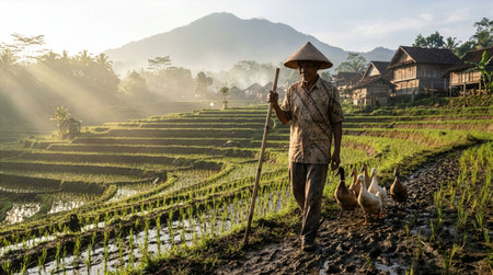 Farmer working on the rice terraces in Bali, Indonesia