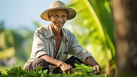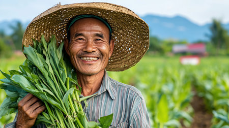 Happy Asian farmer in a straw hat holds freshly harvested green vegetables in a lush field, radiating joy and pride in his work.