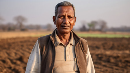 Close-up photo of An Indian Aged man farmer sitting in the field looking at the camera, India