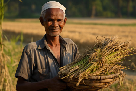 Indian farmer with basket of rice on the rice field in India.