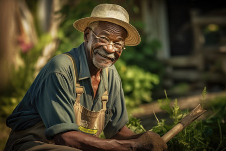 Male African elderly gardening in backyard plants grass. Generative AI AIG23.