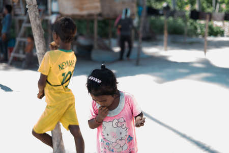 Mabul Island, Sabah, Malaysia - Aug 08, 2018: A happy face and enjoy of the Kids life on Mabul Island, they play with everything around them
