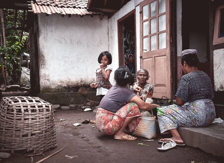 Bali, Indonesia - Sep 19, 2019: Family portrait of a rural Indonesian people sitting on the street in front of their traditional house.