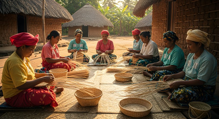 Unidentified Burmese women are making traditional threshing basket at the market in Kanchanaburi, Thailand.