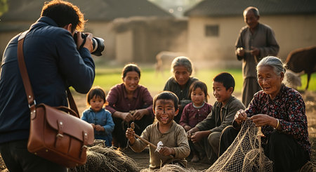 In a beautiful rural agricultural setting, a young woman joyfully exchanges fresh greens with an elderly person