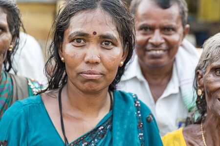 PUTTAPARTHI, ANDHRA PRADESH, INDIA - JULY 9, 2017: People in the local indian market. Copy space for text