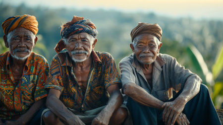 A powerful group portrait of elderly men and women from an African village, dressed in traditional clothing and headwraps. They look towards the camera with expressions of wisdom, dignity, and resilience, representing culture, community, and heritage.