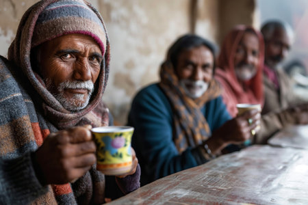 Group of Indian people enjoying a cozy tea break together, with focus on the person in the foreground