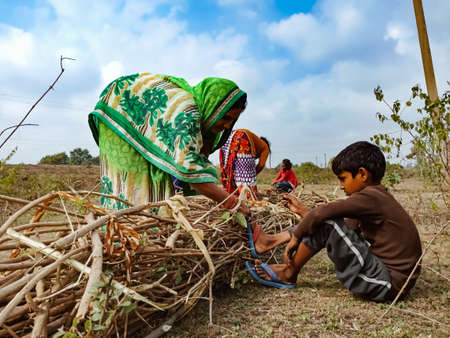 DISTRICT KATNI, INDIA - JANUARY 01, 2020: An indian village woman with his child binding wooden fire sticks on forest area at blue sky background.