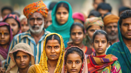 A large group of Indian Muslim men gathers in a rural village, engaged in earnest conversation, representing unity and cultural heritage in their community.