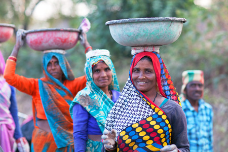 KHAJURAHO, INDIA - JANUARY 5, 2016: Indian women working hard in road-building in Khajuraho, Madhya Pradesh State, India
