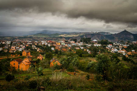Village against tea plantation in clouds. Agriculture landscape in Sri Lanka.