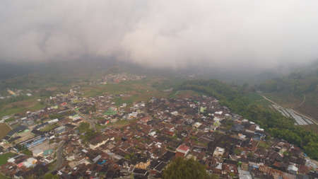 asian town in mountains among agricultural land, rice terraces, fog and clouds Java Indonesia. mountains with farmlands, rice fields, village, fields with crops, trees. Aerial view farm lands on mountainside. tropical landscape