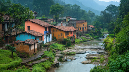 A picturesque stream winding through a South Asian village, with traditional houses lining the banks.