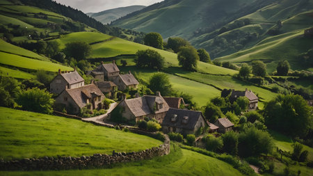 A picturesque village nestled in a valley, with stone cottages and a river running through it