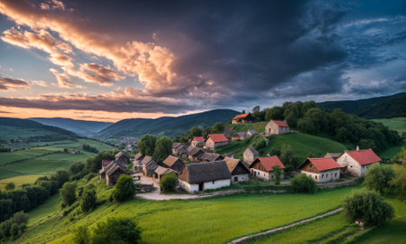 A village nestled in rolling green hills is partially shaded by dark clouds in the distance, showing a blend of nature and rural life during late afternoon.