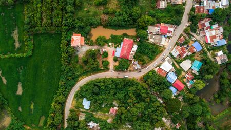 Aerial top view of residential local houses in Mon village, nature trees, Kanchanaburi, Thailand in urban city town in Asia, buildings.