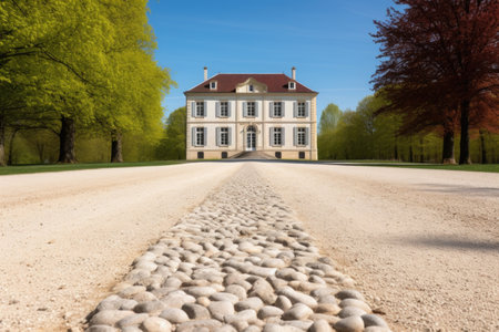 white gravel circular driveway in front of a large french country estate, created with generative ai
