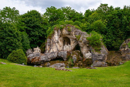 Stone grotto with sculptures set against a backdrop of lush green trees and grass under a cloudy sky at Palace of Versailles, Paris.