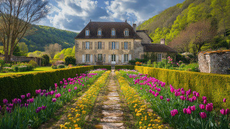 A formal garden with rows of blooming flowers leading to a classic French house, ideal for serene scenes.