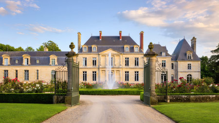 Grand Château Entrance with Open Gates and Fountain at Sunset