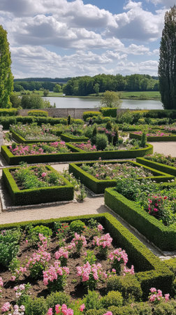 A formal French garden with vibrant flower arrangements, trimmed hedges, and an elegant stone pathway.