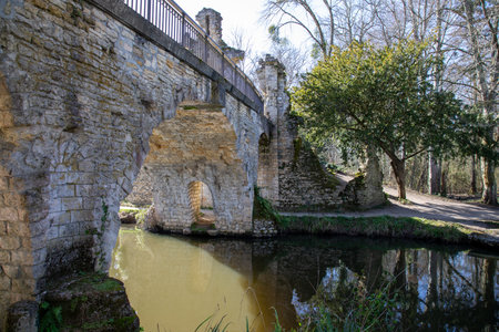 old stone medieval bridge over the river in Blanquefort France with water reflection