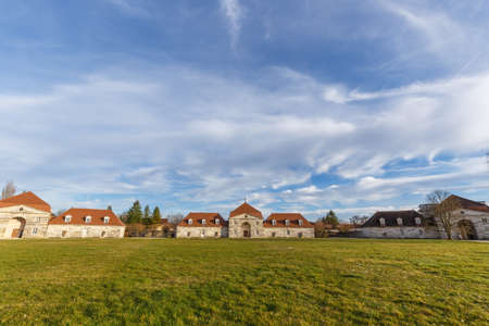 Lysice castle, Czech Republic. Famous baroque castle built in 14th century. Beautiful formal garden, palm trees and flowers. Promenade near the castle. Sunny day, dramatic clouds before storm.