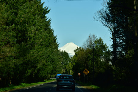 Osorno volcano view from refugio teskie road sunset vacation travel. High quality photo