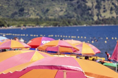 Colored beach umbrellas in a beach near a lake in the Araucania, Chile.