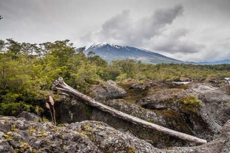 The Petrohue Falls and Osorno Volcano with its snow peak in Puerto Varas in cloudy weather, south of Chile.