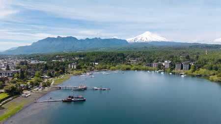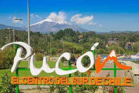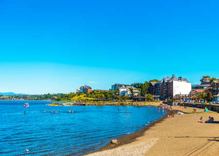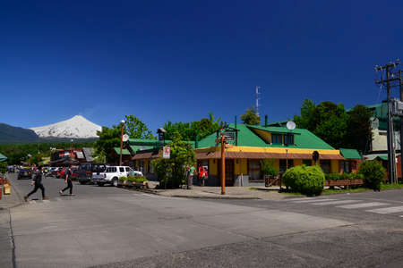 PUCON, CHILE - SEPTEMBER, 23, 2018: Pucon town in central Chile on a blue skies sunny day