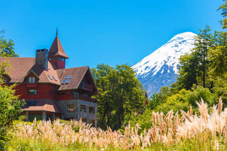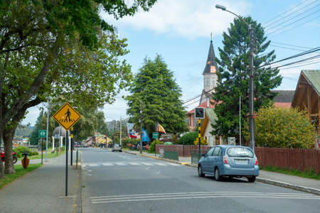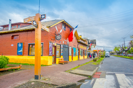 PUCON, CHILE - SEPTEMBER, 23, 2018: Outdoor view of beautiful wooden colonial buildings located in the city of Pucon