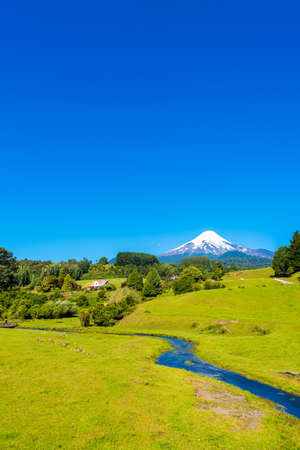 Osorno Vulcano with snow cap green meadows Chile. High quality photo