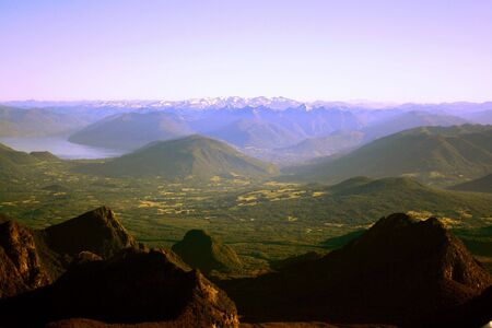 Prominent snowcapped Villarrica volcano rises above layers of hazy mountain ranges under a clear, blue sky in the distance. Patagonia, South America