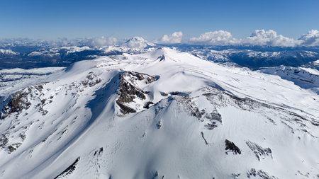 Aerial view of snowcapped Lanin volcano dominates a panoramic view of layered mountain ranges under a clear, blue sky. Neuquen, Argentina