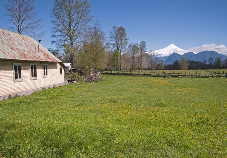 Meadow in Pucon with the snow capped Villarrica Volcano in the distance.