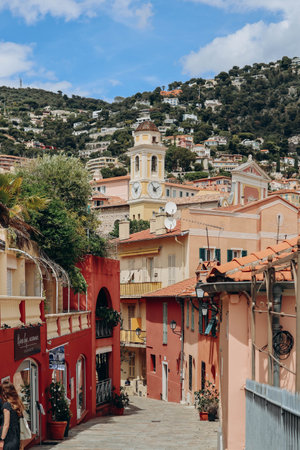 Villefranche-sur-Mer, France - 18 May 2023: Streets in the center of Villefranche sur Mer on a cloudy day
